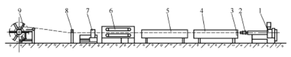 Понастоящем PVC и PO тръбите са най-обемните продукти както в страната, така и в чужбина.Фигура 1показва диаграмата на производствения процес за полиолефинови (PO) тръби. Пластмасата се подава в матрицата с пръстеновидна междина (2) от шнека като равномерно пластифицирана стопилка, екструдираща тръбна заготовка. Той незабавно влиза в калибриращия модул (3) за охлаждане и оразмеряване, след което се подлага на допълнително достатъчно охлаждане в охладителния резервоар (4). Тръбата се изтегля с постоянна скорост от регулируемияединица за изтегляне(6)и накрая се нарязва на определени дължини от ножа (7). Тънкостенни тръби с диаметър под 160 мм могат да се навиват на рула от машината за навиване (9).