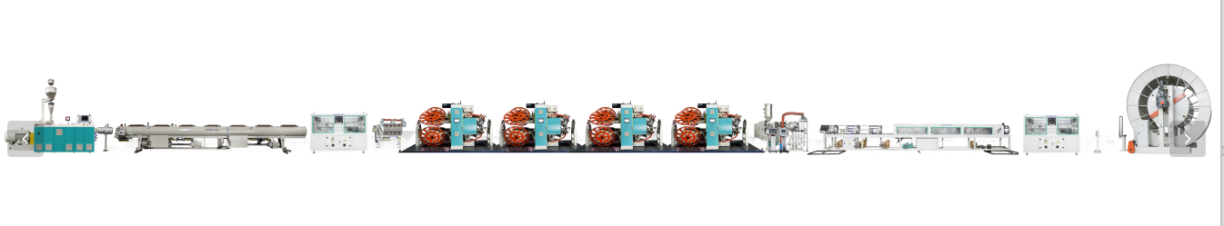 Линия за екструдиране на подсилени термопластични тръби (RTP).се състои от три части. Първата част е оборудването за екструдиране на вътрешни пластмасови тръби; Втората част е междинният слой оборудване за навиване, подсилено с неметална тел; Третата част е външнатаУстройство за екструдиране на HDPE покритие. Той има предимствата на висока ефективност, висока скорост, висока автоматизация и икономия на енергия. Това е идеално оборудване за производство на RTP композитни тръби.