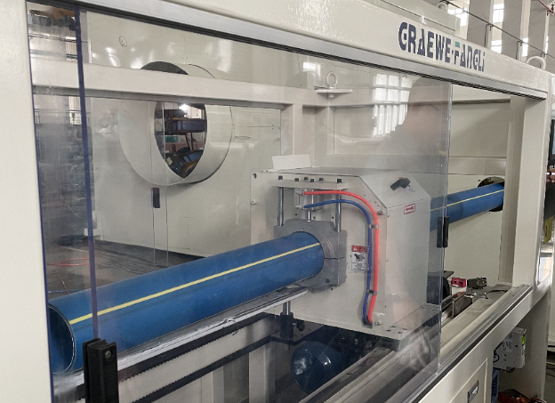 Четвърто, тръбата се тегли от тяговата единица на гъсеницата и се изпраща в фрезата, където тръбата се отрязва според предварително зададената дължина; в същото време прахът от рязане се отстранява от прахоуловителя.
